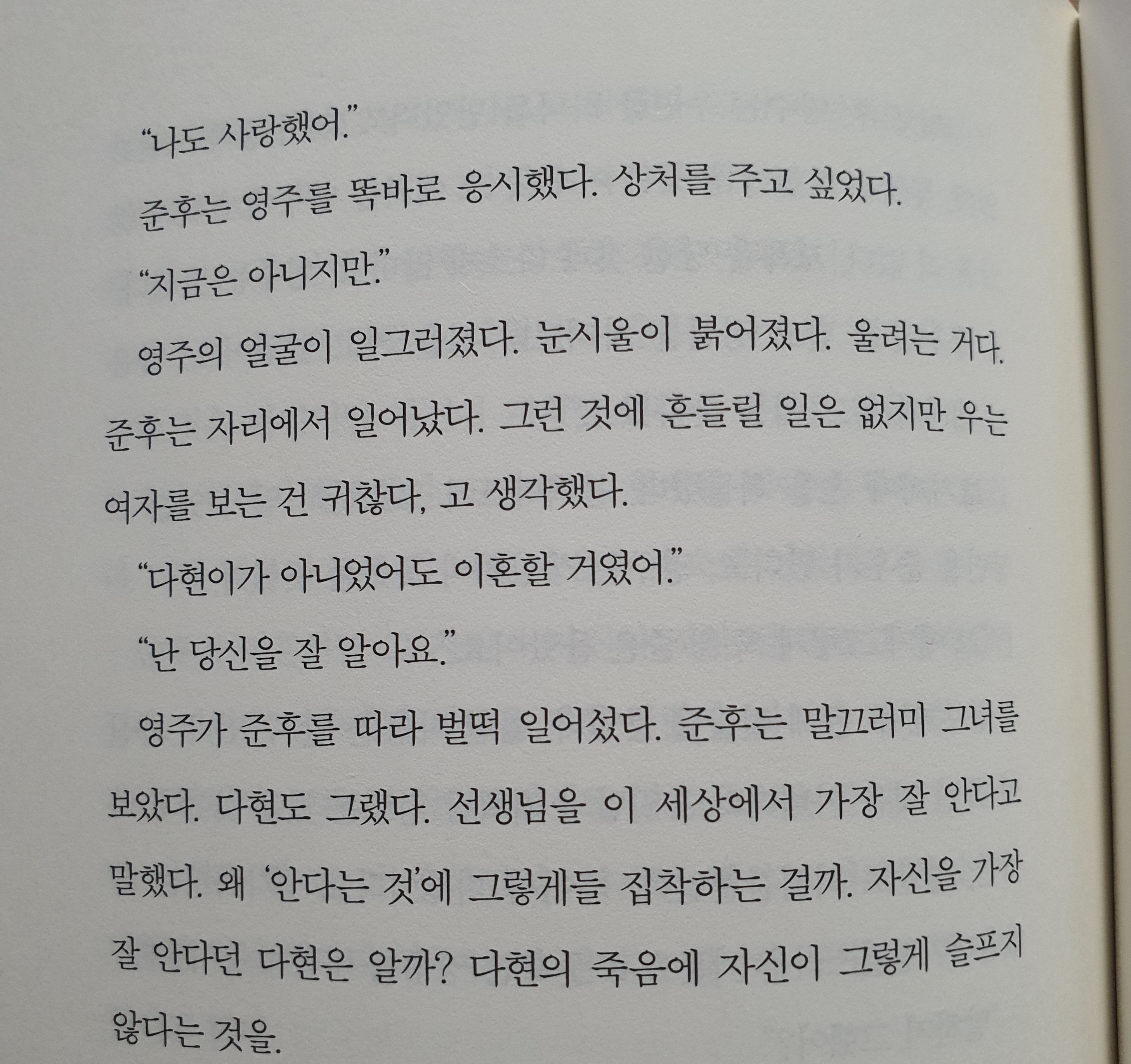 영주가 준후를 따라 벌떡 일어섰다. 준후는 말끄러미 그녀를 보았다. 다현도 그랬다. 선생님을 이 세상에서 가장 잘 안다고 말했다. 왜 '안다는 것'에 그렇게들 집착하는 걸까. 자신을 가장 잘 안다던 다현은 알까? 다현의 죽음에 자신이 그렇게 슬프지 않다는 것을.